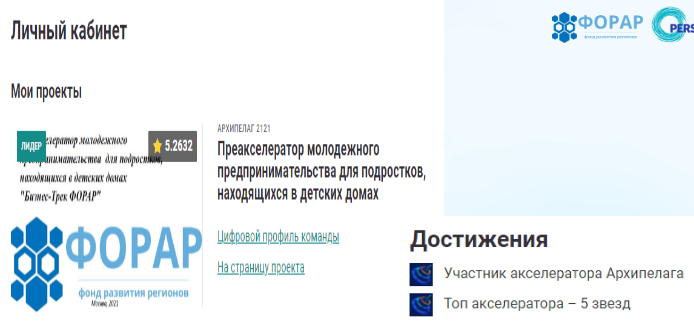 Проект Фонда ФОРАР «Преакселератор молодежного предпринимательства для подростков, находящихся в детских домах» прошел акселерацию на Архипелаге 2121 и получил результат «ТОП акселератора-5 звезд». «Приглашаем инвесторов и спонсоров присоединиться к нашему проекту. С большой радостью готовы сотрудничать с регионами, которые понимают значение нашего проекта», - отметила президент фонда Дробах Елена.